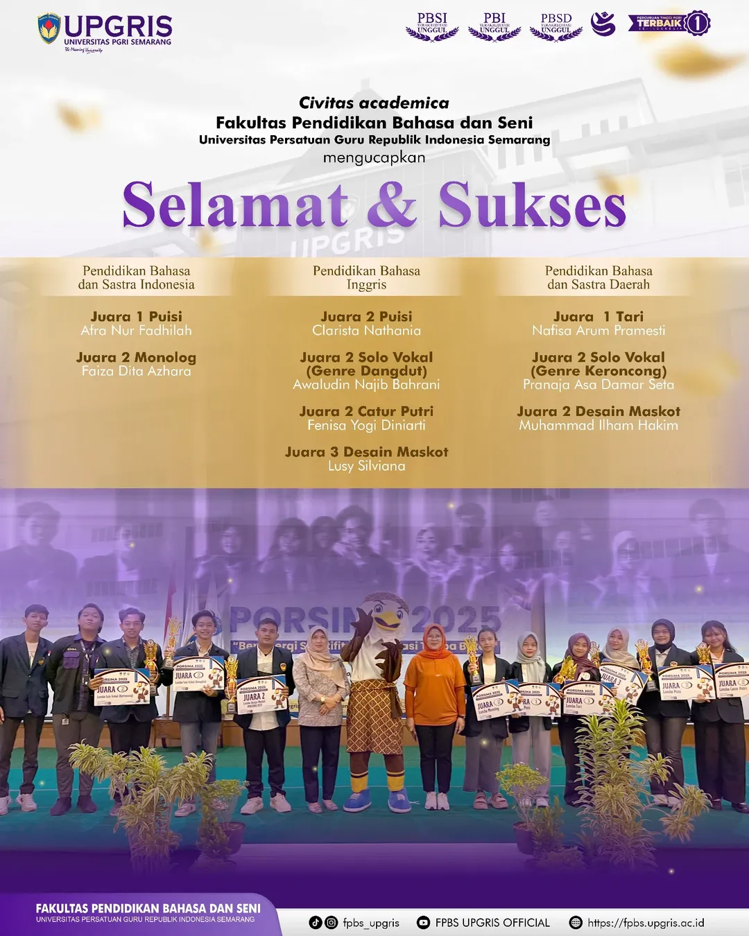 Civitas academica Fakultas Pendidikan Bahasa dan Seni UPGRIS mengucapkan apresiasi yang setinggi-tingginya kepada para mahasiswa berprestasi yang telah mengharumkan nama fakultas dalam ajang PORSIMA UPGRIS 2025